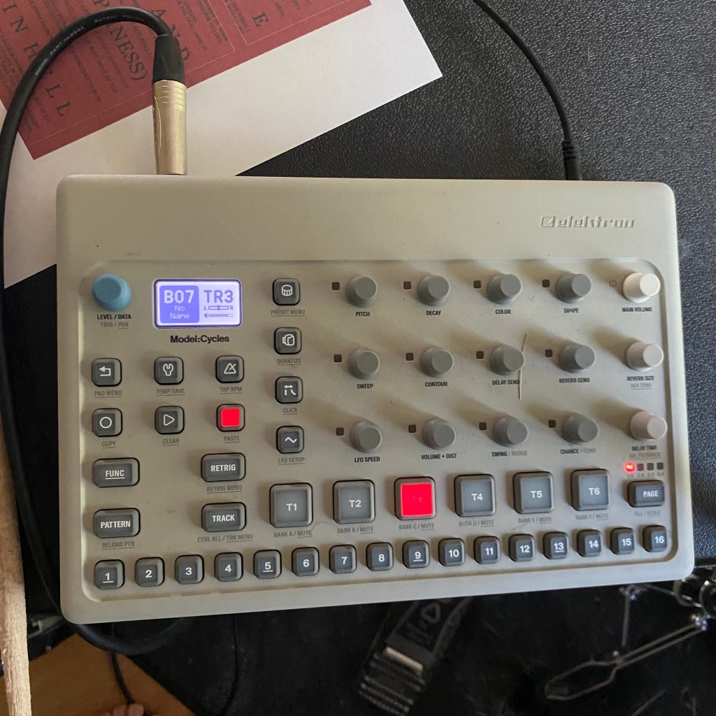 another piece of gear i’ve been using lately is the elektron cycles. it’s an analog fm drum machine, and i’ve been running it through an old fender amp with the distortion cranked up, which makes it sound like a ball of steel wool.